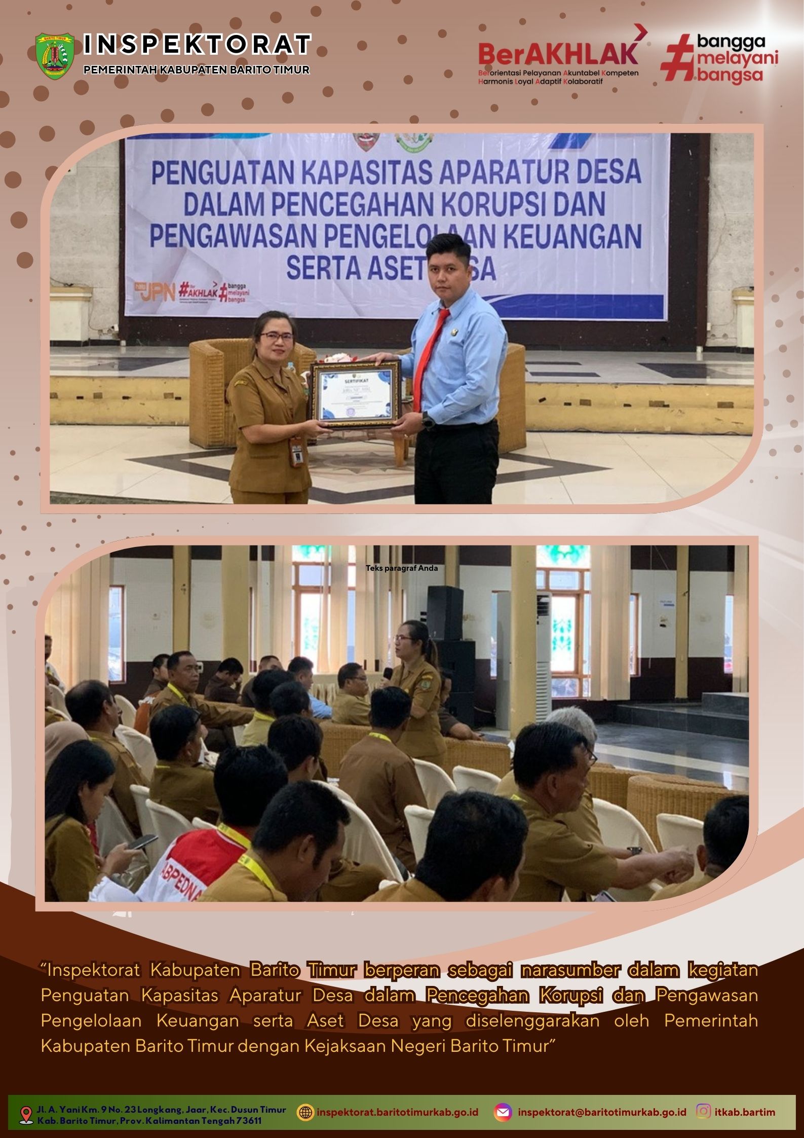 Inspektorat Kabupaten Barito Timur berperan sebagai Narasumber dalam kegiatan “Penguatan Kapasitas Aparatur Desa dalam Pencegahan Korupsi dan Pengawasan Pengelolaan Keuangan ...