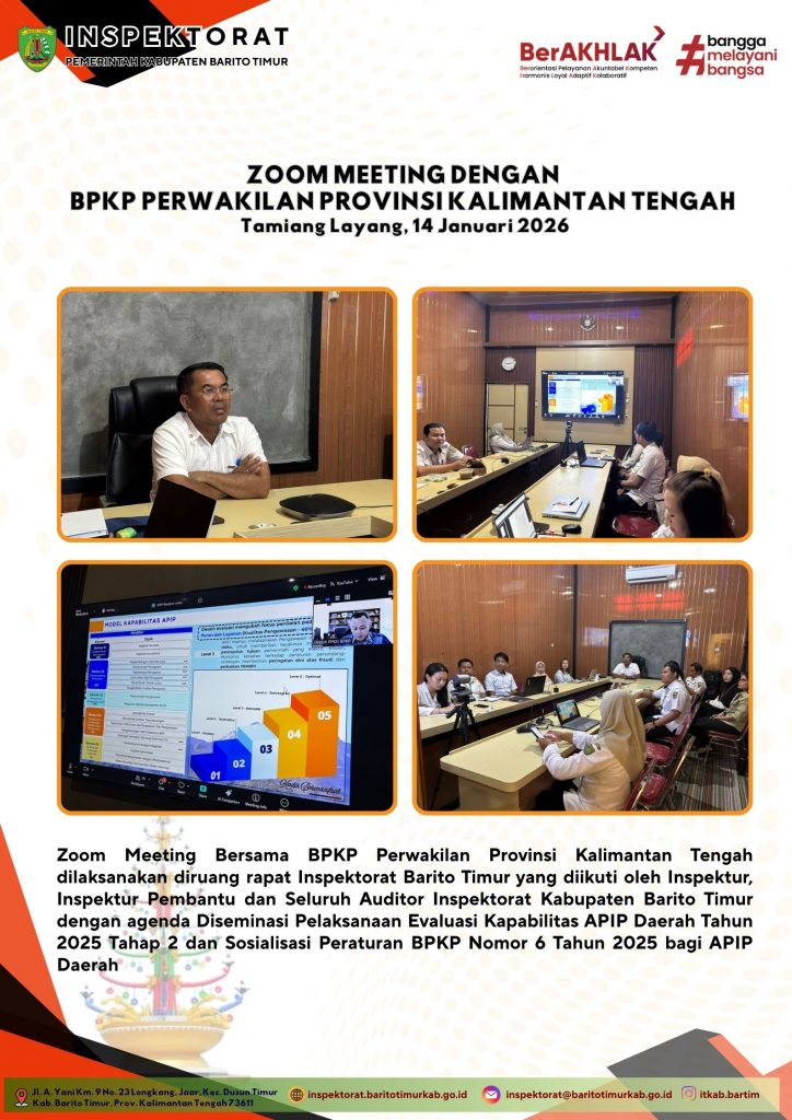 Zoom Meeting Dengan BPKP Perwakilan Prov. Kalteng dengan Agenda Diseminasi Pelaksanaan Evaluasi Kapabilitas APIP Daerah Tahun 2025 Tahap 2 dan Sosialisasi Peraturan BPKP Nomor 6 Tahun 2025 bagi APIP Daerah 15/01/202615/01/2026 Admin InspektoratAdmin Inspektorat Categories: Uncategorized Navigasi pos Sebelumnya Previous post: